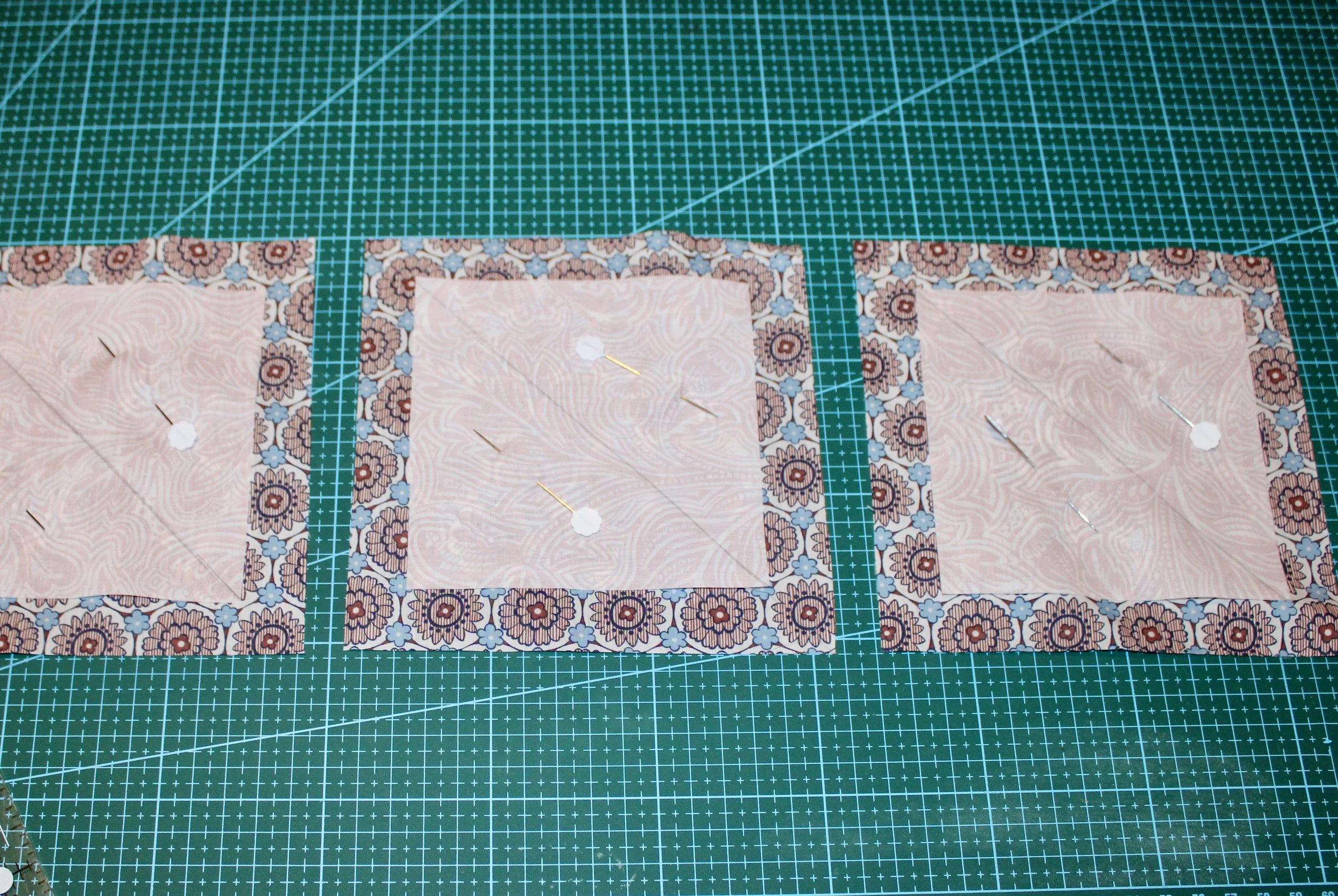 Stack smaller square on larger square centered and right sides together. Draw a diagonal line from corner to corner and pin both sides.