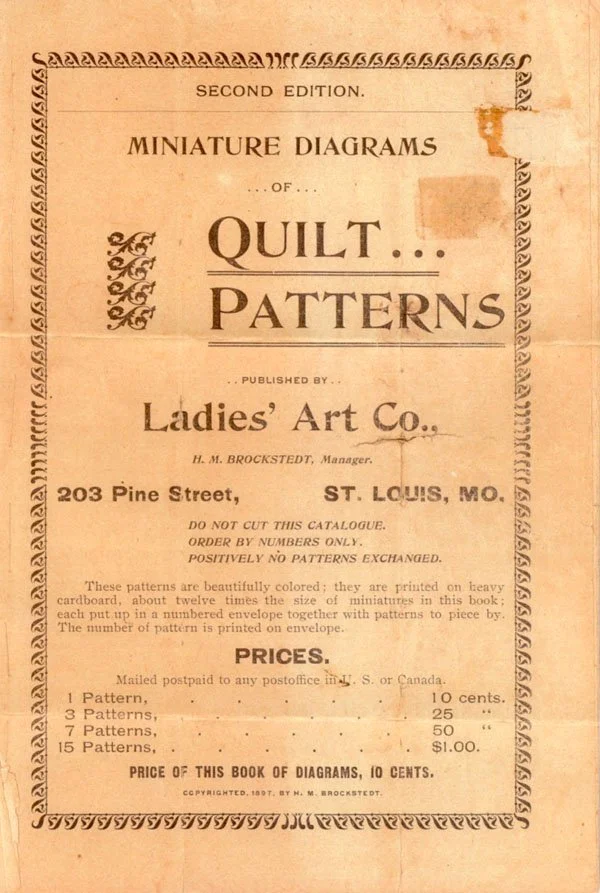 All documentation found so far points to the fact that the Ladies Art Company was established in 1889. Magazines ads in 1895 mentioned 272 quilt blocks to choose from and a catalog was published in 1897 listing 400 different blocks. The rest is history! Ladies Art Co. was the first business to offer hundreds of quilt patterns in a mail order catalog. While their patterns predate the Kansas City Star patterns and others published in newspapers and books, a large majority of blocks were published in the 1880s through the 1890s.