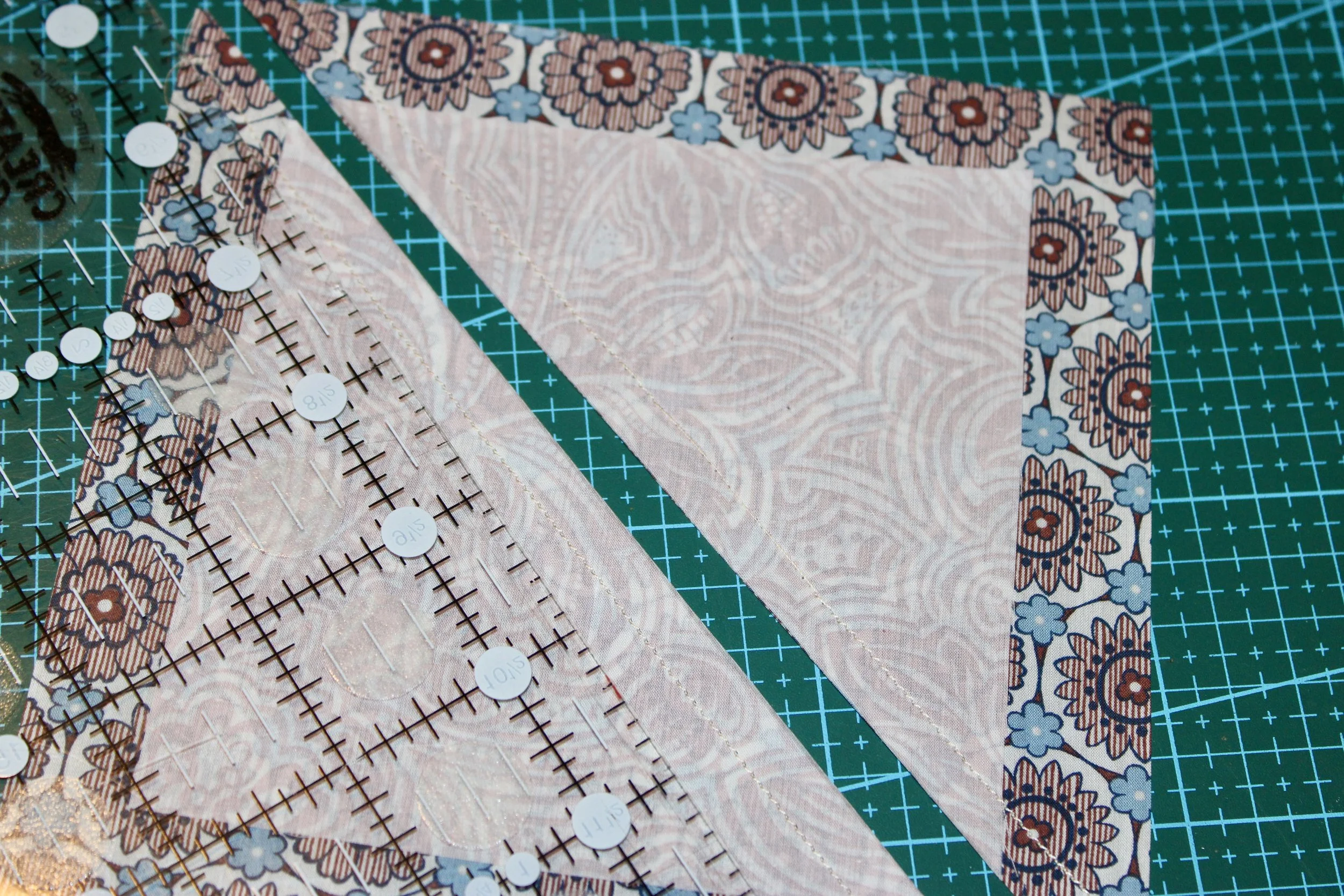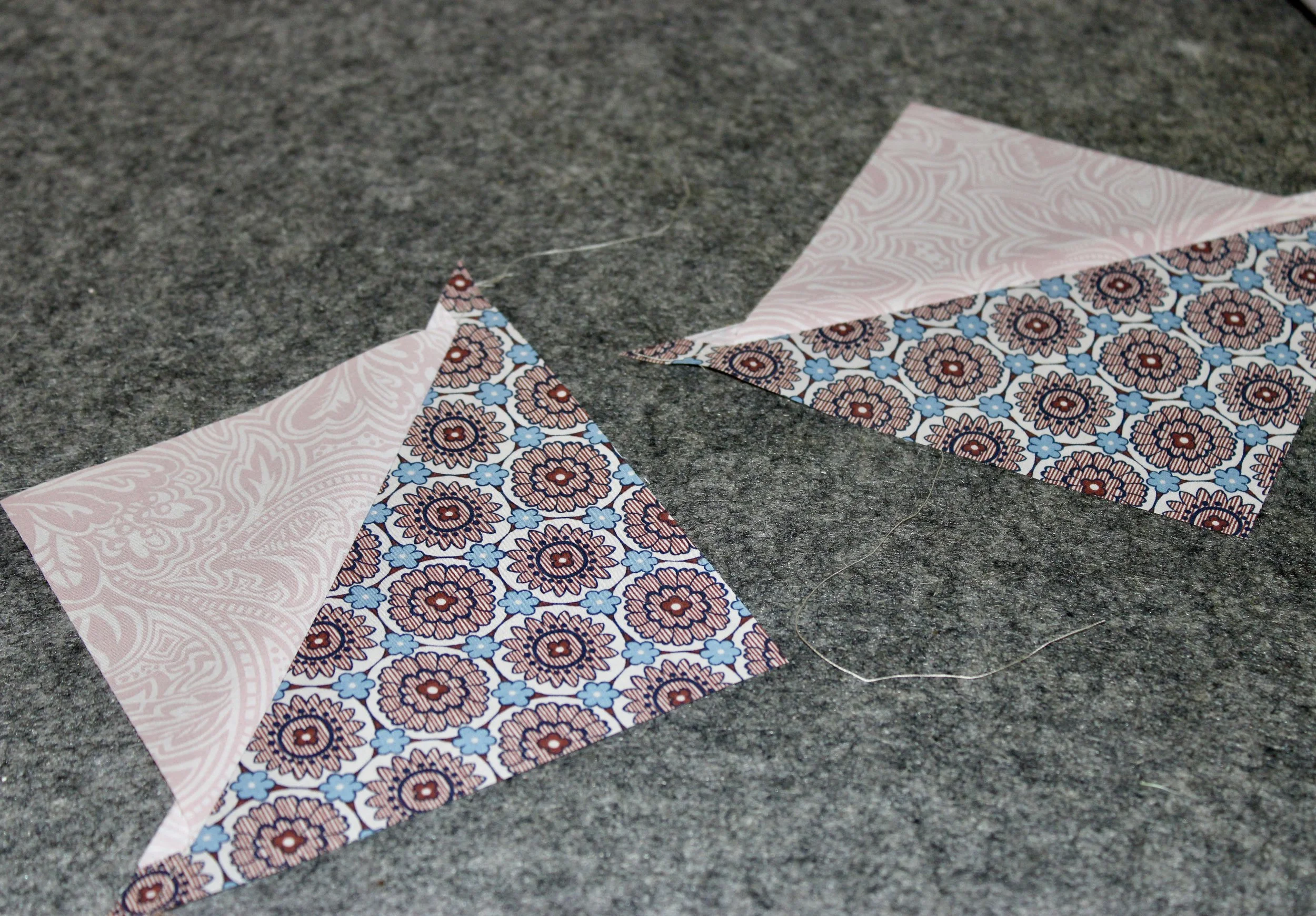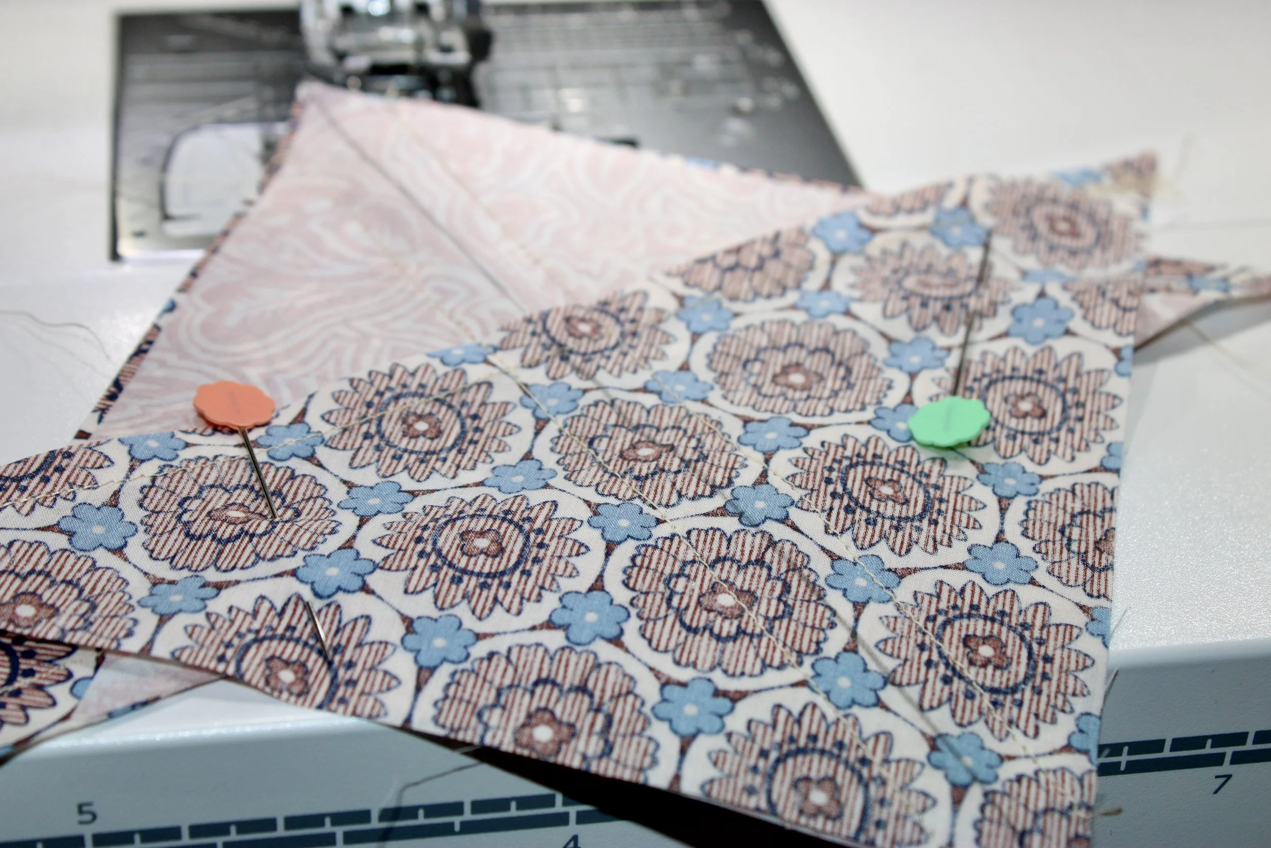 Next stack two of your open squares on top of each other right sides together. Then draw another diagonal line and pin on both sides.