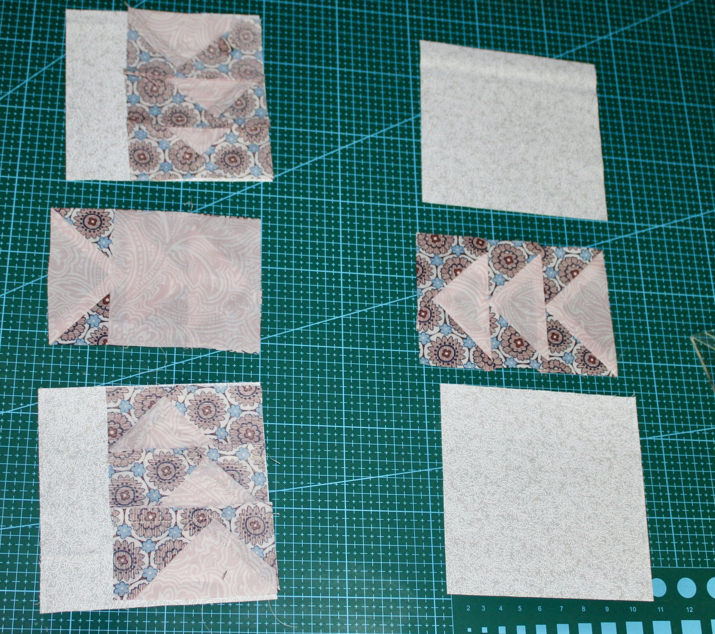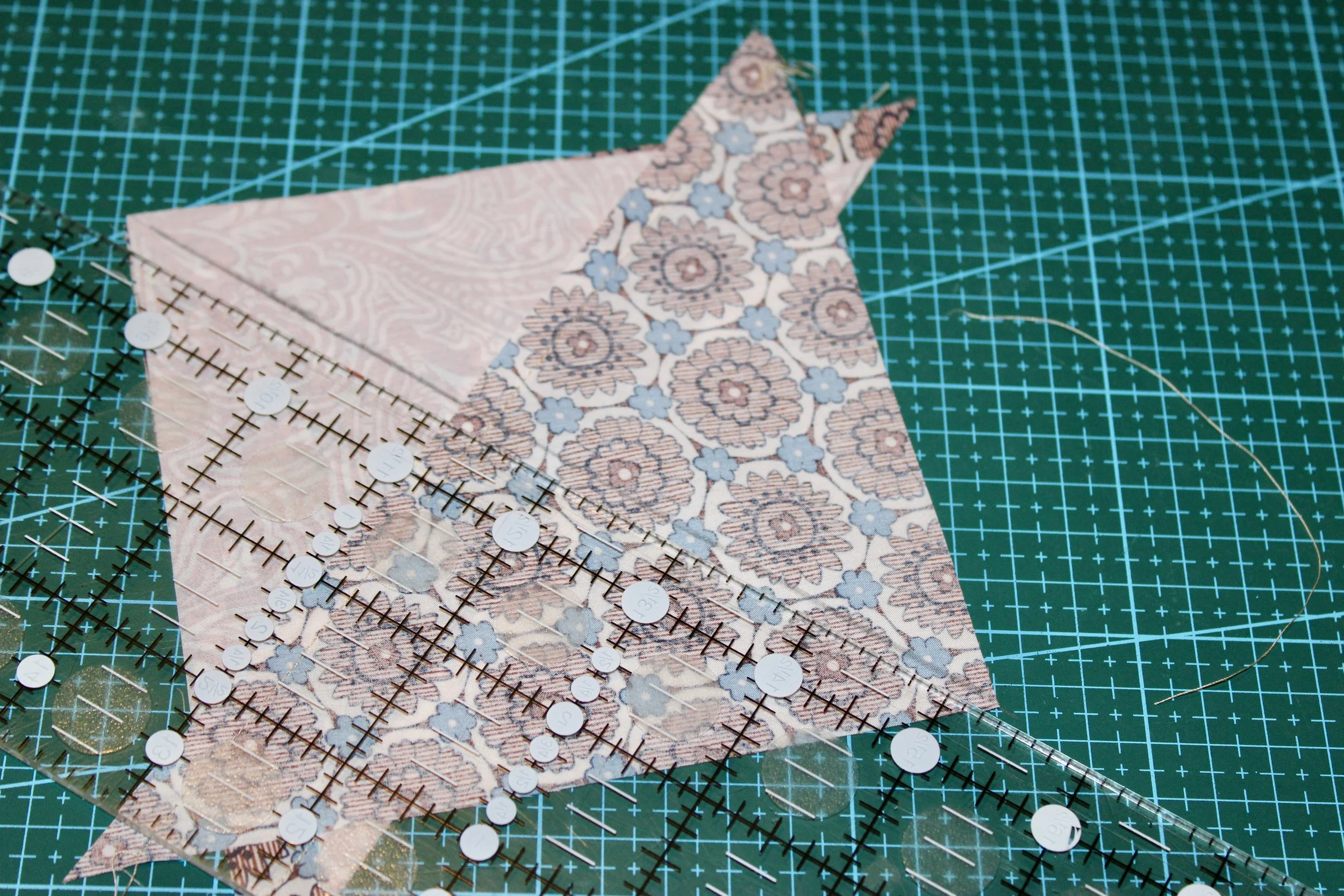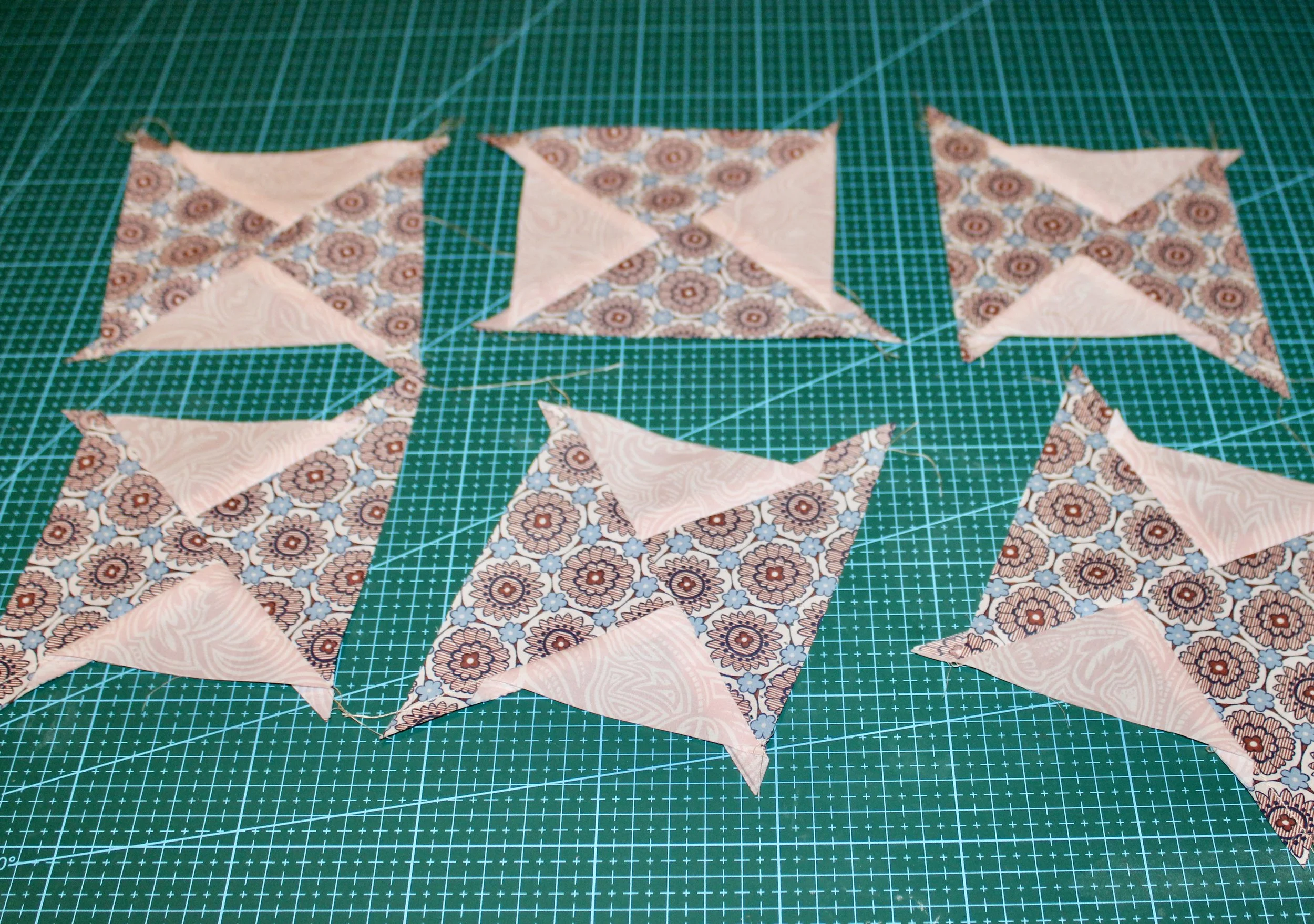 After sewing the second round of seams, cut again on your pencil line and press open you will now have what will become 12 geese after they are trimmed in the next step.